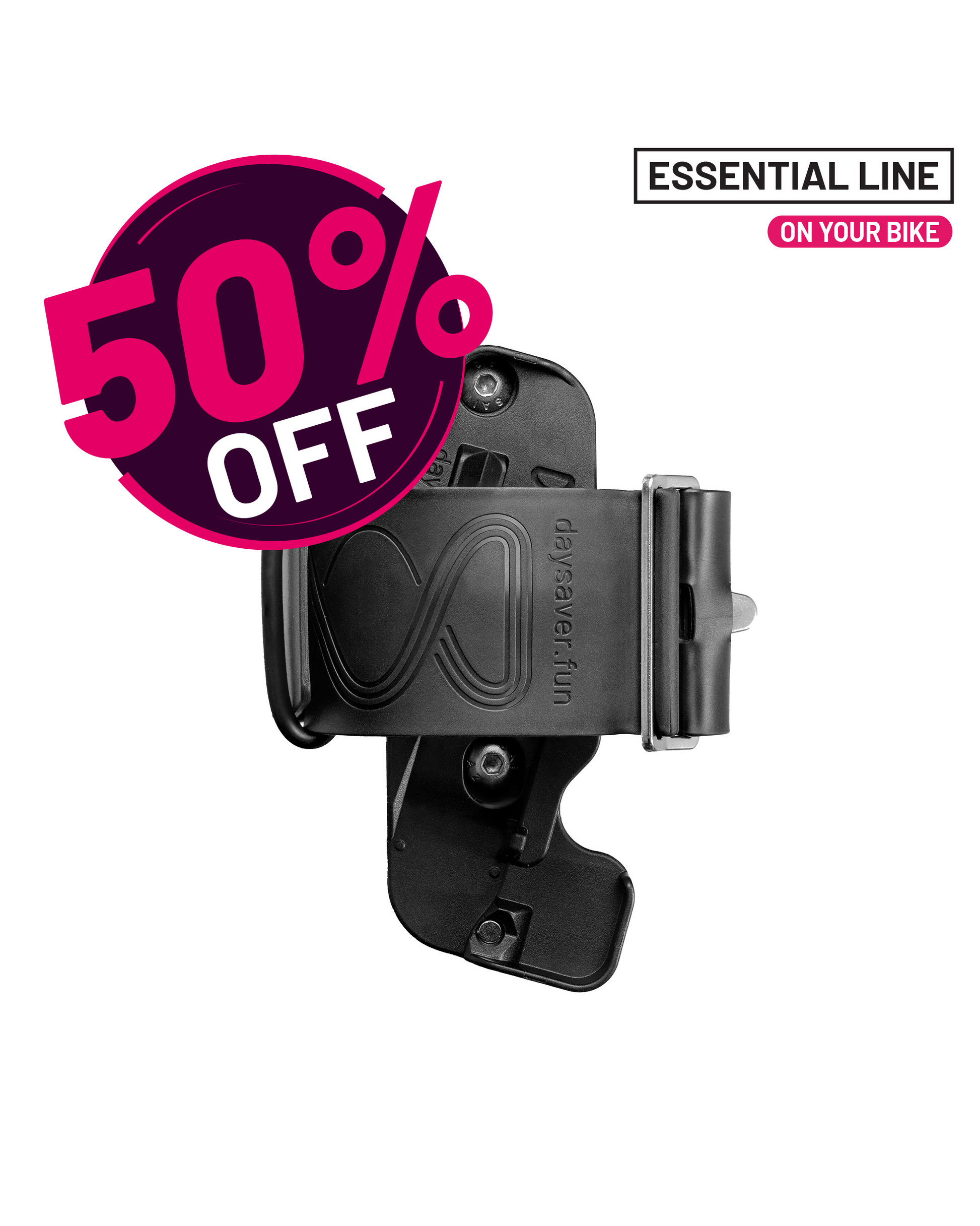 Befestige das Daysaver-Multitool Essential8 oder Original9 und die Multitool-Erweiterung Coworking5 zusammen mit allen anderen Dingen, die dir potenziell den Tag retten könnten – wie einem Schlauch und/oder einer Minipumpe – mit dem Cradle an deinem Rahmen. Die Whip sichert alles klapperfrei.